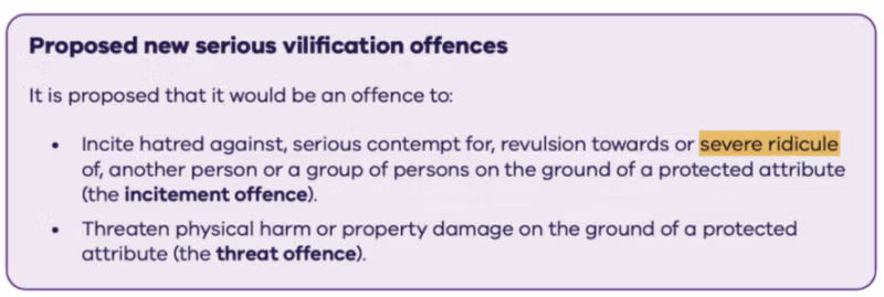 In effetti, secondo le riforme proposte, si potrebbe essere perseguiti penalmente per incitamento al “grave scherno” sulla base di un attributo protetto, con una pena massima di tre anni di carcere.