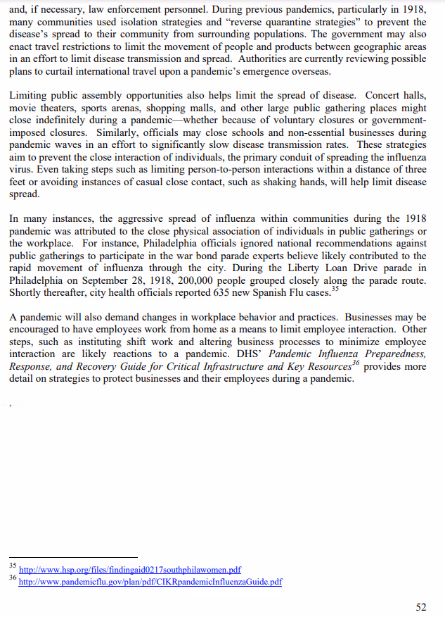 Il piano contiene l'elenco originale delle "attività essenziali" pandemiche che è stato utilizzato dalla CISA nel 2020 per bloccare l'America. Il piano del 2007 (a sua volta basato su a Piano del Dipartimento per la sicurezza interna dell'anno precedente) afferma chiaramente l'intenzione di vietare i grandi assembramenti "a tempo indeterminato", chiudere scuole e attività non essenziali, istituire il lavoro da casa e mettere in quarantena individui esposti e non solo malati. L'obiettivo è semplice e chiaro: rallentare la diffusione per attendere un vaccino.