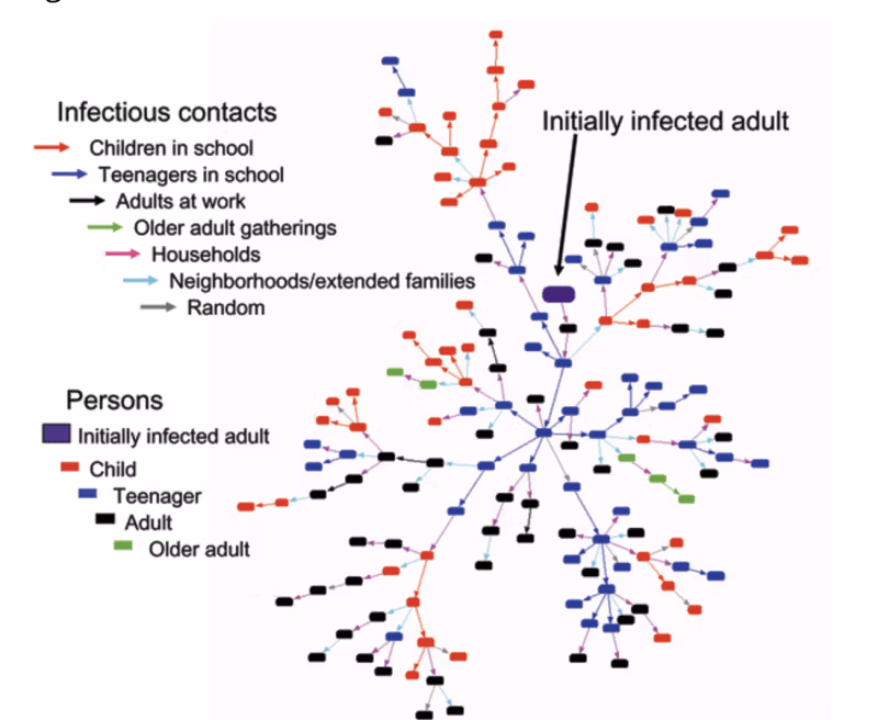 Il distanziamento sociale mirato per mitigare l'influenza pandemica può essere progettato attraverso la simulazione della diffusione dell'influenza all'interno delle reti di contatto sociale della comunità locale. Dimostriamo questo progetto per una comunità stilizzata rappresentante di una piccola città negli Stati Uniti. L'importanza fondamentale dei bambini e degli adolescenti nella trasmissione dell'influenza viene prima identificata e presa di mira. Per l'influenza infettiva come l'influenza asiatica del 1957-58 (≈50% infetta), la chiusura delle scuole e il mantenimento in casa di bambini e adolescenti ha ridotto il tasso di attacchi di oltre il 90%. Per ceppi più infettivi o trasmissione meno focalizzata sui giovani, devono essere presi di mira anche gli adulti e l'ambiente di lavoro. Su misura per comunità specifiche in tutto il mondo, tale design produrrebbe difese locali contro un ceppo altamente virulento in assenza di vaccini e farmaci antivirali.