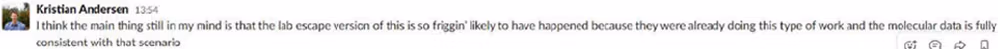 Ma è forse perché non li consideravano anomali, o piuttosto perché erano preoccupati che le implicazioni dell’anomalia fossero troppo scioccanti per essere approfondite? Il contenuto del loro FOIA e-mail and Messaggi lenti chiarisce che è quest'ultimo. Anche loro hanno visto l'anomalia, ma non hanno voluto parlarne, poiché, come ha affermato Edward Holmes, sia in un'e-mail del 4 febbraio 2020 a Jeremy Farrar che in un messaggio del gruppo Slack dello stesso giorno, "questo ci farà guardare come dei pazzi."