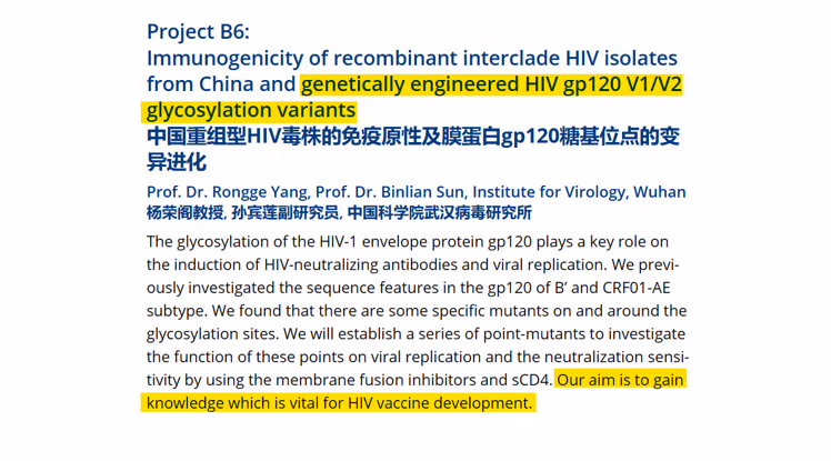 Come si può vedere in la descrizione di seguito, il sottoprogetto B6 di TRR60, sotto la direzione dei professori Rongge Yang e Binlian Sun dell'Istituto di virologia di Wuhan, era dedicato allo studio delle "varianti di glicosilazione gp120 V1/V2 dell'HIV geneticamente modificate" allo scopo di facilitare "lo sviluppo del vaccino contro l'HIV .”