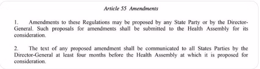 Sebbene le norme e i regolamenti dell’Articolo 55 per la modifica dell’RSI richiedano esplicitamente che “il testo di qualsiasi proposta di emendamento sia comunicato a tutti gli Stati parti dal Direttore generale almeno quattro mesi prima dell’Assemblea sanitaria alla quale è proposto per l’esame ”, il requisito di quattro mesi per la revisione è stato ignorato nella fretta di produrre qualche risultato tangibile da parte dell’Assemblea. Questa azione affrettata e illegale è stata intrapresa in diretta violazione del suo stesso statuto, dimostrando ancora una volta un disprezzo arbitrario e capriccioso delle regole stabilite e dei precedenti da parte dell’OMS sotto la guida del Direttore Generale.