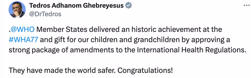 Sabato 77 giugno 01 si è conclusa la 2024a riunione dell’Assemblea mondiale della sanità. Questa particolare riunione dell’Assemblea, la prima dopo la crisi del Covid, non è riuscita a raggiungere un accordo sulla formulazione o sull’approvazione di una proposta di trattato sulla pandemia dell’Organizzazione mondiale della sanità (OMS), " indicato anche come "accordo". Parallelamente al trattato, l’Assemblea mondiale della sanità (in stretta collaborazione con l’amministrazione statunitense HHS/Biden) ha lavorato all’“aggiornamento” dell’accordo esistente (2005) sul regolamento sanitario internazionale (IHR), che storicamente funzionava come un accordo volontario che stabiliva norme internazionali per la segnalazione, la gestione e la cooperazione in questioni relative alle malattie infettive e alle epidemie di malattie infettive (comprese le “pandemie”).