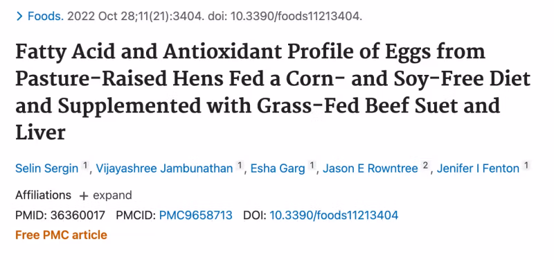 L'obiettivo di questo studio era di caratterizzare i profili di acidi grassi e antiossidanti del tuorlo d'uovo utilizzando uova di galline allevate al pascolo alimentate con una dieta priva di mais e soia e integrate con sugna e fegato GFB rispetto alle uova di galline allevate al pascolo alimentate con mais e soia. mangime per galline a strati di soia e uova ottenute commercialmente da gabbie. Anche il profilo vitaminico e minerale del tuorlo d'uovo è stato valutato da un laboratorio commerciale.