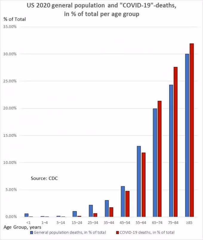 In media, tuttavia, le “morti COVID-19” avrebbero lasciato questo mondo nello stesso momento, con Corona o da/con altro virus o altra malattia. (In effetti, un numero elevato di loro probabilmente morì qualcosa d'altro rispetto a COVID-19.) Non siamo immortali. In media, moriamo alla nostra età media di morte.