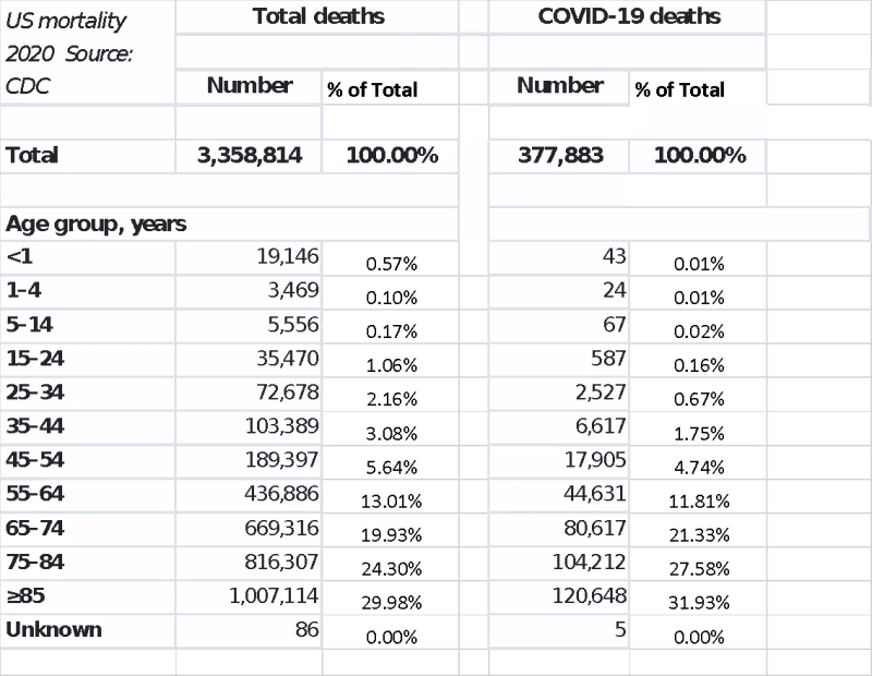 Secondo il CDC, gli Stati Uniti d'America hanno perso 3,358,814 dei suoi cittadini nel 2020, un aumento corretto per l'età del 15.9% rispetto al 2019. Per il CDC, la ragione di questo aumento è apparentemente evidente e chiara: COVID-19, che "è diventata la terza principale causa di morte".